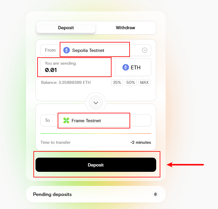 2.跨链 进入测试网跨链桥,选择从Sepolia Testnet 跨到→ Frame Testnet 点击Deposit进行跨链:至少跨0.01个测试eth 链接:https://frame.xyz/bridge