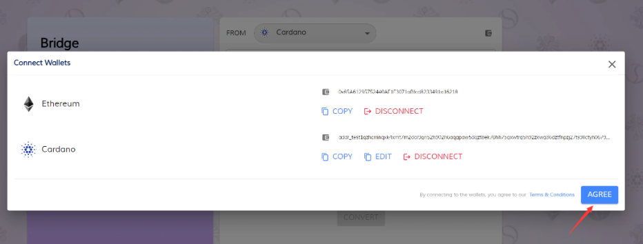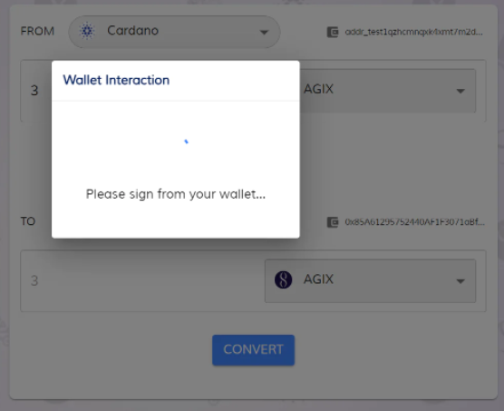 12.Return the assets from Cardano to Ether, enter the amount and click CONVERT to authorize.