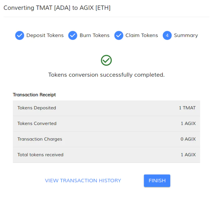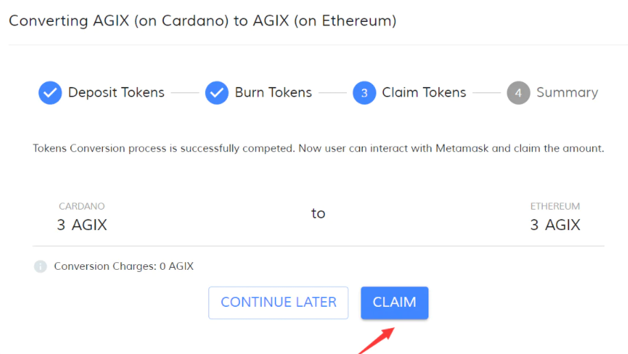 Click the "chaim" button to receive the AGIX from Cardano to your ethereum wallet and then sign to confirm it.