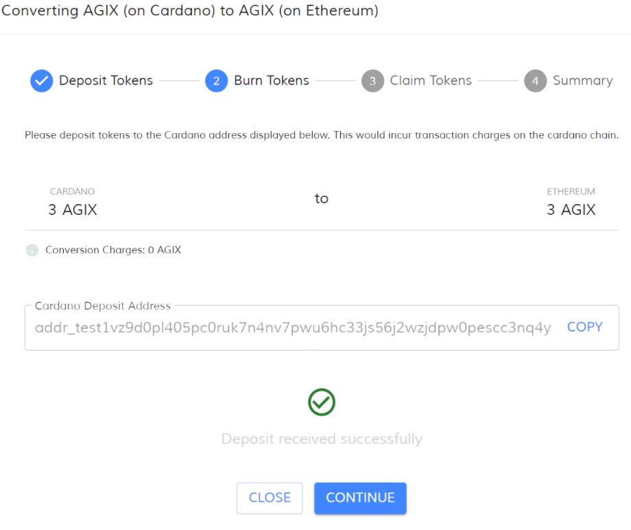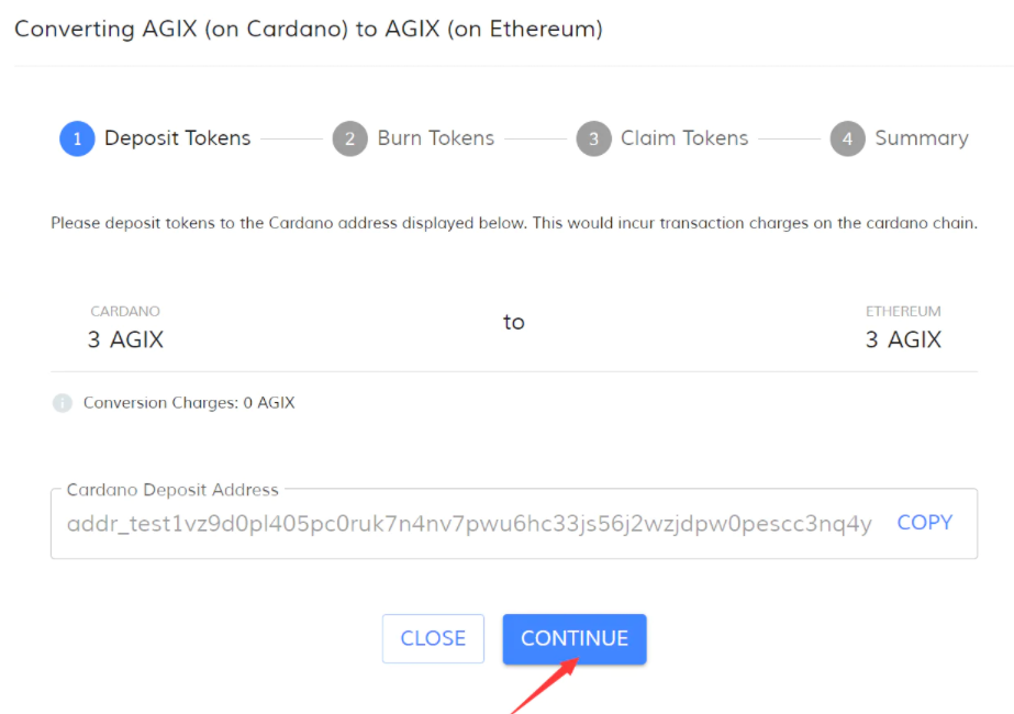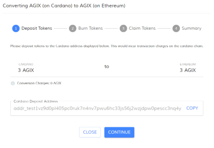 After signing the authorization, you will see a Cardano address, first copy this address and then deposit the same amount of AGIX into this wallet.