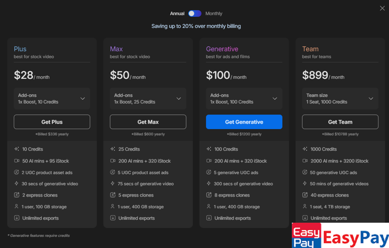 Generative $120/月 或 $100/年 高级生成式UGC广告功能与更大存储容量