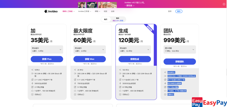 Plus $28/月 或 $35/年 提供学分与视频时长限制,基础功能解锁