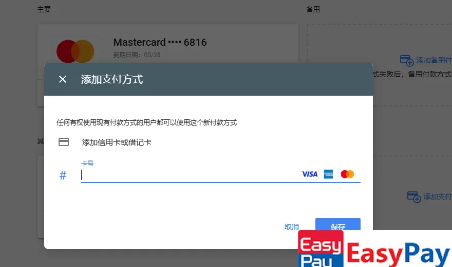 付款方式:推荐使用EasyPay 提供的虚拟信用卡,注册流程简便,兼容 Google Ads 广告账户使用。