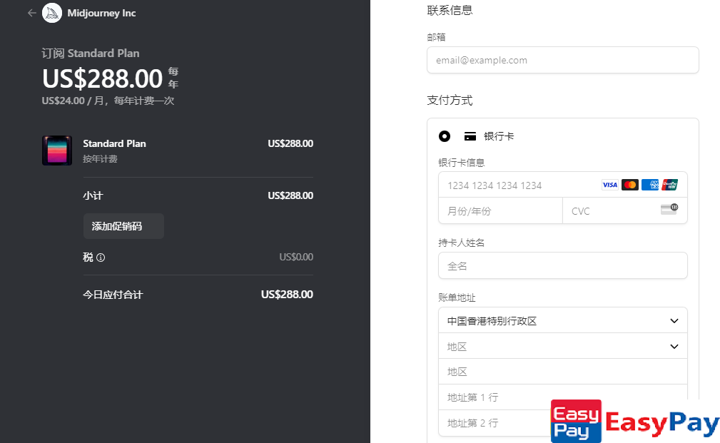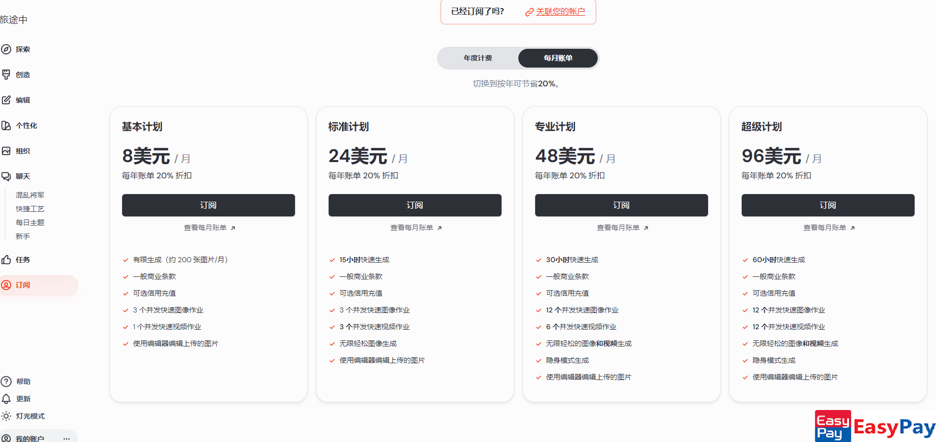 通过 EasyPay 虚拟信用卡,国内用户完全可以轻松完成 AI绘画工具订阅方式 的支付流程,不必再为银行卡限制而烦恼。只要按以上步骤操作,就能快速开通 Midjourney 会员,畅享无限 AI 创作的乐趣。