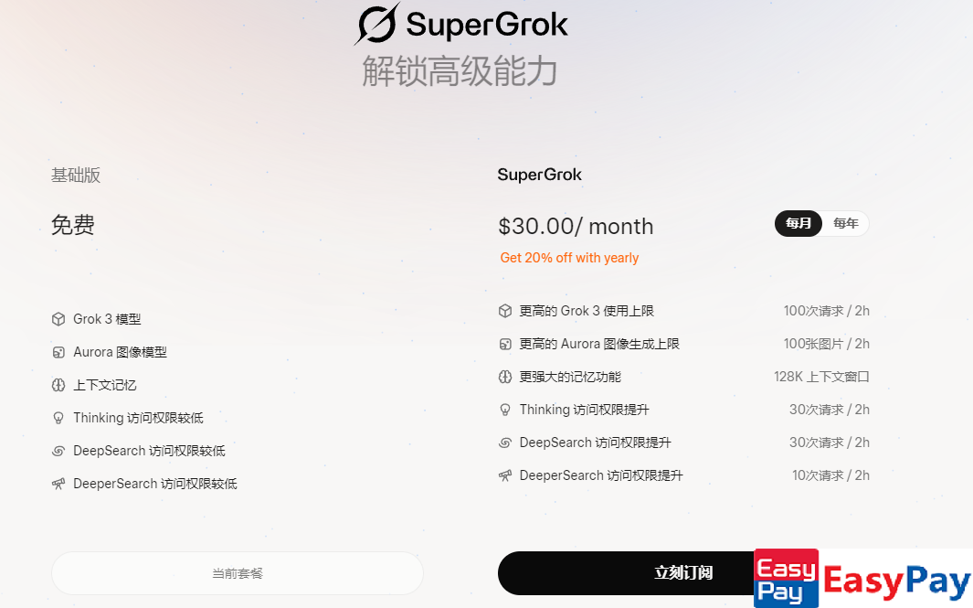 订阅方式价格功能月付$30/月解锁全部 Grok 模型、历史记录、多轮对话年付$300/年更优惠,适合长期用户