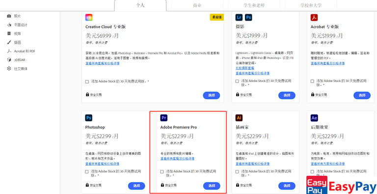 Adobe官网提供多种订阅选择,包括单独购买或套装订阅: