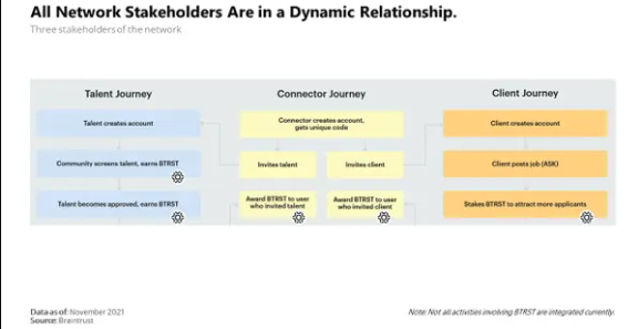 除了寻求经过审查的知识工作者的客户和寻求职业发展机会的人才外,第三个代理人还充当均衡的供需双方的流动性提供者。这些被称为“联络人”的独立招聘人员在维持网络的动态流动方面发挥着关键作用,因为他们邀请新客户和知识工作者加入Braintrust,并通过推荐将人才与特定工作联系起来。对于通过他们的推荐链接促成的每张付费发票,连接器都会获得 BTRST 代币奖励,这将它们变成网络性能及其所有权和治理的主要参与者。