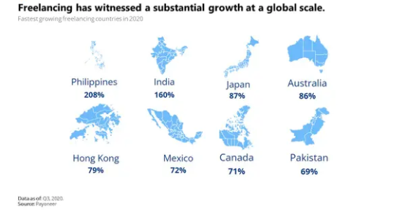 同时,公司能够降低招聘成本,并获得外包运营和服务的能力,从而使他们能够建立集中的团队并增强内部专业化。反过来,这些互惠互利为工人创造了数百万个就业机会,并引领了自由职业者经济的发展。目前,全球有1.63 亿自由职业者在在线劳动力平台上注册,2019 年收入总额高达 5200 亿美元,预计在 7 年内以每年 7.7% 的速度增长。