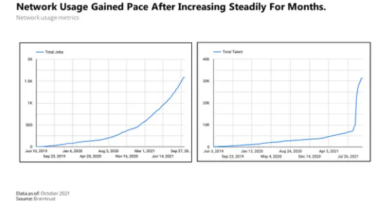 快速启动一个双向市场具有挑战性。幸运的是,代币激励可以帮助建立供需关系的早期(也是困难的)过程。迄今为止,Braintrust 已经显示出网络持续增长的迹象,这反映在其总服务价值上。根据 Braintrust 的每周增长报告,该平台上发布的人才和工作总数在过去一年中呈指数级增长,而最近几周的数据表明,这些指标正在继续以较高的速度增长。