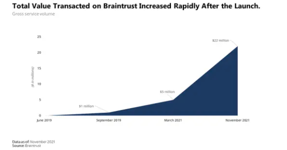 迄今为止,Braintrust 模型结合其 Web3 精神已经产生了积极的结果。2019 年 9 月,Braintrust 网络的总服务量 (GSV) 达到 100 万美元,仅在其隐身推出 9 个月后。然而,真正的加速始于该网络于 2020 年 6 月公开启动后。