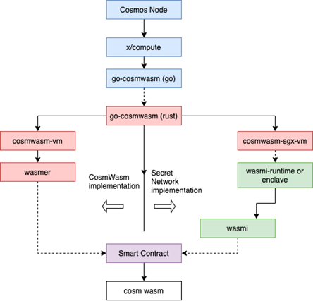 合约的执行如上图所示。左边是正常的 CosmWasm 的执行流程,右边是 Secret Network 合约的计算流程。右边的第一个流程包含 SGX,第二个流程有 Enclave。可以看见 Secret Network 在每一步都依赖于可信执行环境这一个概念。