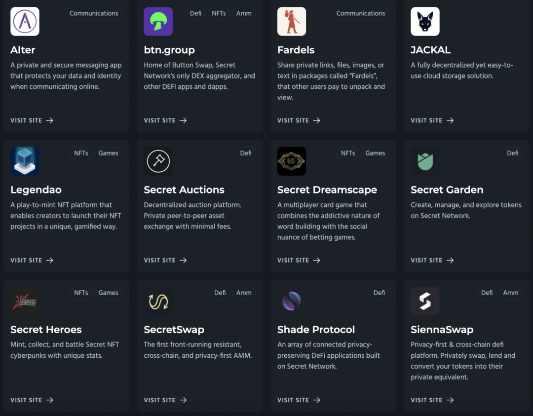 Secret Network 已经建立了许多生态内应用,比如 Shade protocol、Sienna.network。 Shade Protocol 和Silk(Shade的稳定币)与SecretSwap 和 SiennaSwap 集成。Shade Protocol 是迄今为止最重要的 Secret 产品发布之一。