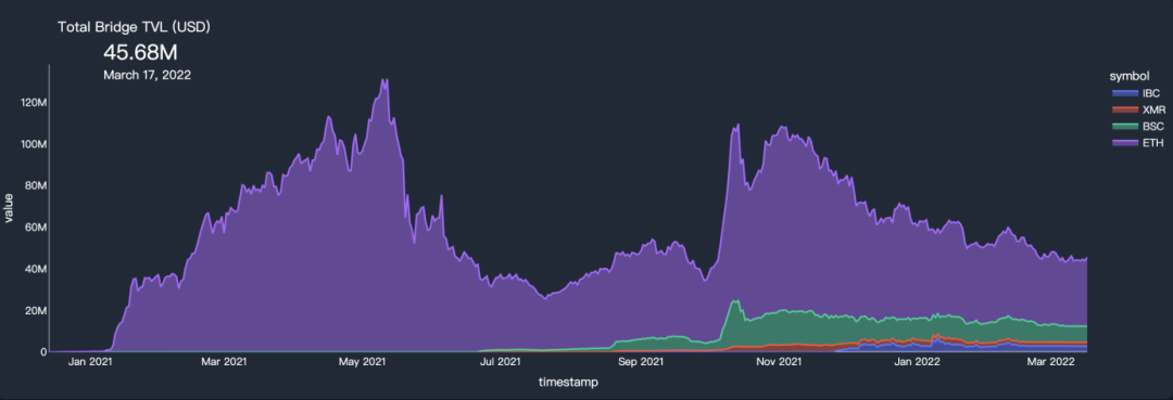当前Secret上已存在4种跨链渠道,IBC、XMR(门罗币)、BSC、ETH,其中以太坊的跨链桥和跨链交易量是比例最大的部分,随着短期交易量的下滑,以及跨链桥激励方案的不足,TVL在这一阶段处于下降趋势,但也达到了4,500万+美元。