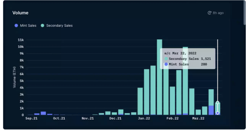 3 月的第一周,交易量和交易次数急剧下降;这可能受 Treasure 上漏洞事件的影响,Treasure 指示用户在漏洞发生后取消 NFT 的挂单。同样,这一趋势也反映在 Treasure 市场的二级销售市场上。
