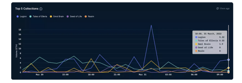 **4、**在 Treasure 上成交的前 5 个 NFT 藏品包括 Smol Brains、Legions、Seed of Life、Tales of Elleria 和 Realm。