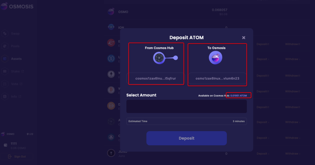 Osmosis的跨链转账功能在官网的「Asset」界面实现。界面内会显示与Osmosis相连接的各条链上的资产,通过Deposit/Withdraw,就可以将其他链上的资产转入/转出Osmosis链。Deposit/Withdraw在这里就是对跨链的一种描述。
