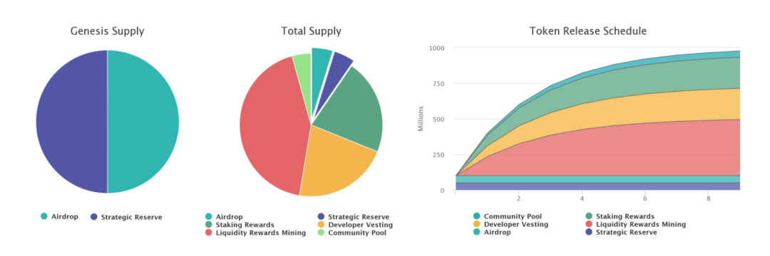 创世阶段生成了1亿枚,一半空投给ATOM持有者,另一半作为战略资金留存。每年新释放的代币中,25%作为质押奖励、25%作为开发分期归属、45%作为流动性挖矿激励、5%作为社区资产。