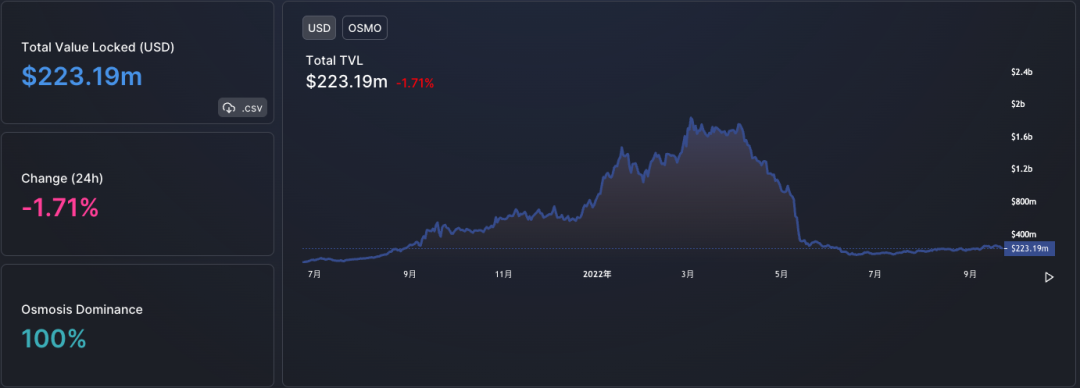 1)凭借覆盖全面的IBC跨链转账功能、多重质押带来的高ARP,Osmosis优秀的用户体验使之成为Cosmos生态内的龙头跨链桥+DEX,TVL稳居2+亿美元,目前位列所有Defi项目TVL的第40位(数据来源:Defi Llama)。未来如果实现ETH/USDC等外部资产的桥接,预计会带来资金量的又一波涨幅。