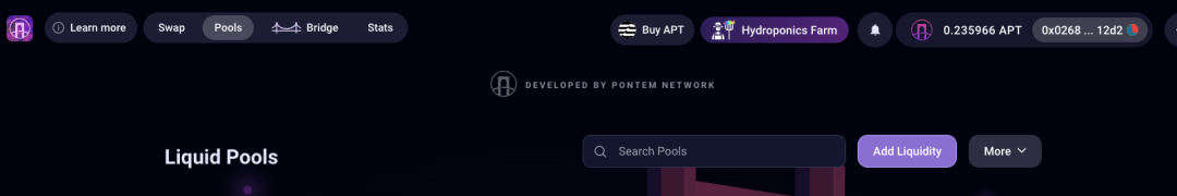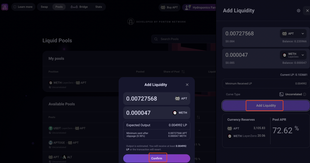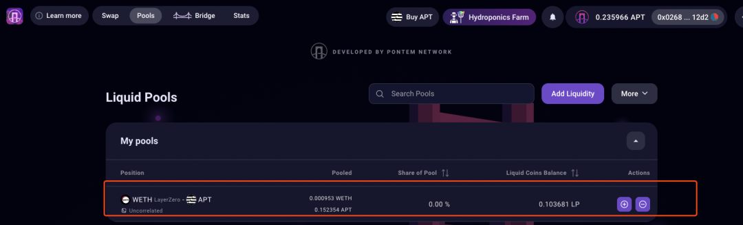 3.2 点击Add Liquidity 添加WETH-APT流动性,注意预留 >0.3 APT余额用于下一步的跨链