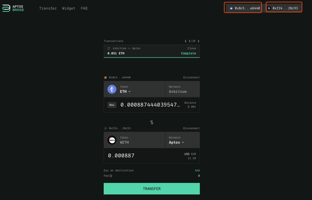 ETH从Arbitrum网络跨链到Aptos网络,多地址为防被女巫建议从大CEX提ETH到小狐狸Arbitrum 网络地址。