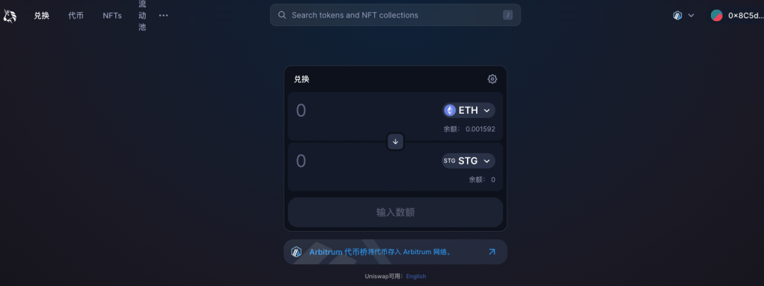 5.1 打开UniSwap链接:https://app.uniswap.org/#/swap 购买STG代币 选择Arbitrum网络,合约地址:0x6694340fc020c5e6b96567843da2df01b2ce1eb6,建议购买数量大于10 STG。