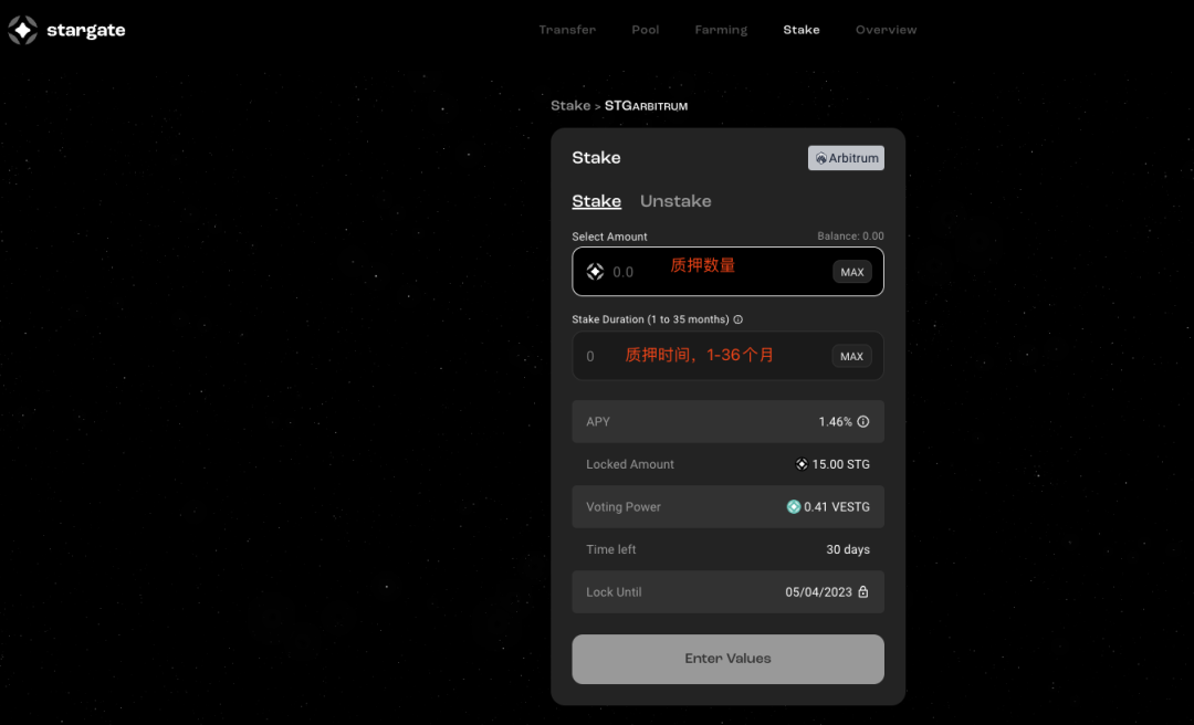 5.2 打开https://stargate.finance/stake 输入STG质押数量,数量建议>10, 质押时间不急卖的话越久越好,点击确认,弹出小狐狸钱包,确认质押即可