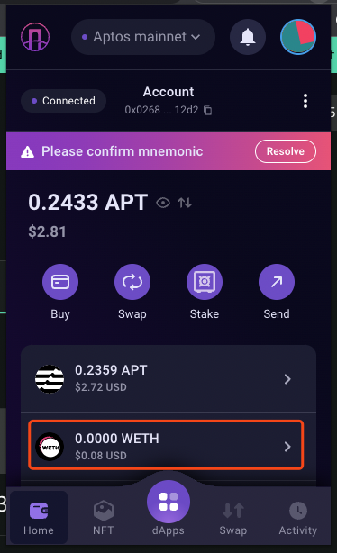 2.3 稍等Aptos上链成功,即可在Pontem钱包上看到WETH余额
