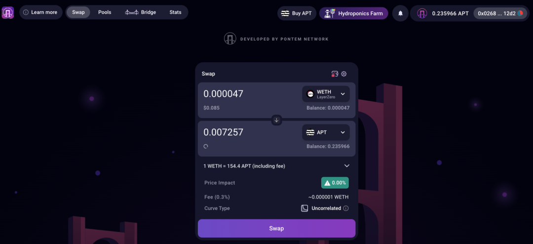 2.2 选择WETH-APT交易对,WETH>0.04E, 点击 Swap 弹出Pontem钱包,点击Confirm