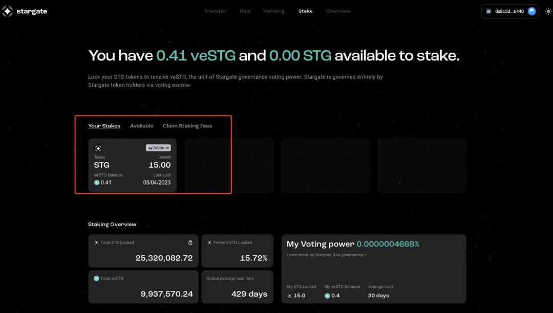 5.3 等待交易上链后即可查看已质押情况 STG质押后得到veSTG,veSTG代表投票权凭证