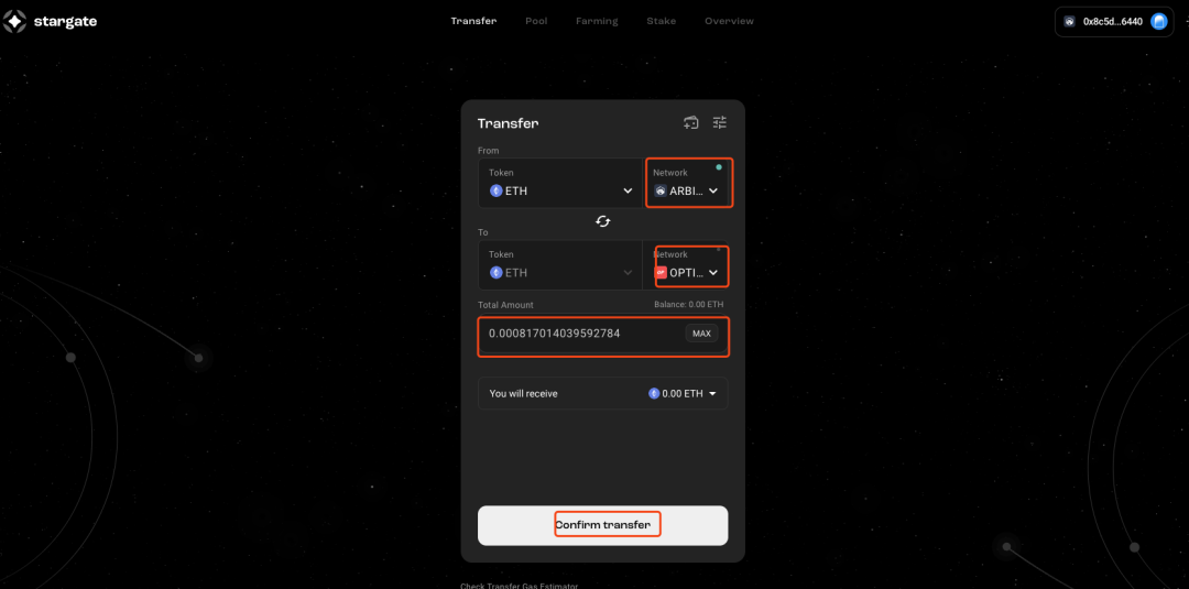 6.1 打开 https://stargate.finance 6.2 将 ETH从Arbitrum网络跨到Optimism网络 选择网络和ETH数量后,点击Confirm transfer,弹出小狐狸,点击确认即可