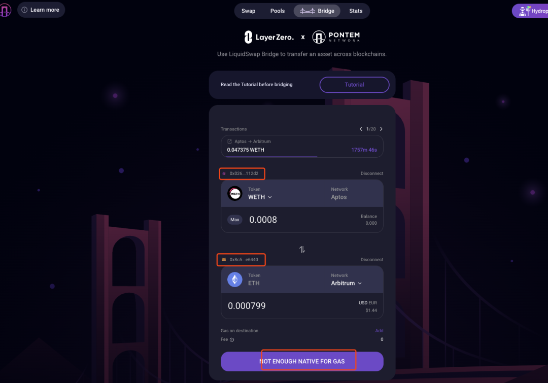4.1 打开liquidswap跨链链接:https://bridge.liquidswap.com 前面的跨链用的是heaptosbridge,现在我们用liquidswap刚好可以交互两个DAPP,顺便看看APT有没有二次空投机会 4.2 输入跨链的WETH金额 建议剩一点WETH预留在Aptos网络,注意此步操作需要大约0.3APT的跨链手续费,即Pontem钱包中至少有0.3 APT余额才行