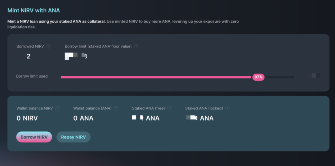 可以重新按照新的锁定的 ANA 代币的地板价估值借出 NIRV,从而完成循环借贷。由于借出的 NIRV 以 ANA 的地板价作为支撑,协议能够保证最终以地板价回收,因此是「零清算风险」的。
