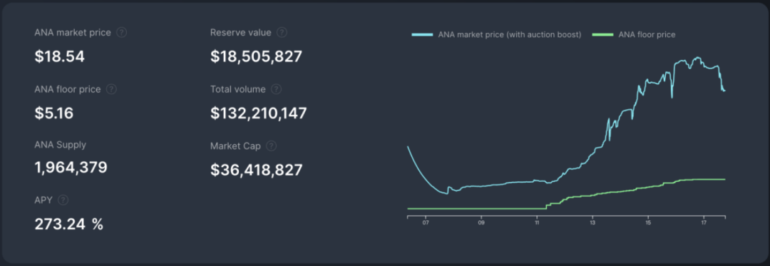 官网数据显示,过去一周,ANA 价格从 3.6 美元一度飙升至 22.5 美元,2022年4月17日价格维持在18.5 美元左右,最高涨幅达到600%左右,这也是热度暴增的原因之一;ANA 回收底价也从 1 美元增长至 5.16 美元,ANA 流通量为196万个,流通市值 3641 万美元,ANA 质押年化收益率 270%左右。