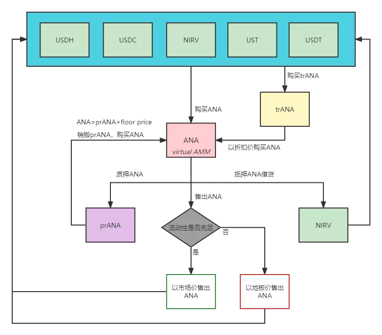 Nirvana系统中有四种代币,ANA、NIRV、prANA和trANA。运行机制如下图所示。