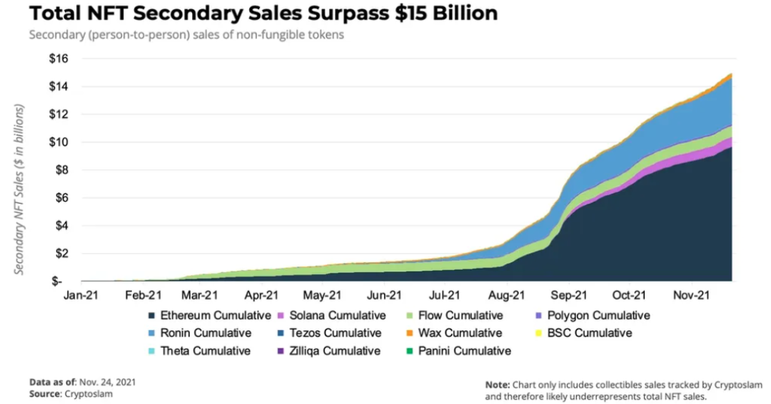NFT 市场的二级销售额已正式超过 150 亿美元,涵盖各种类别,包括游戏、PFP(个人资料图片)、虚拟世界、体育和收藏品。更重要的是,虽然以太坊处于领先地位,但未来的多链日益增多。