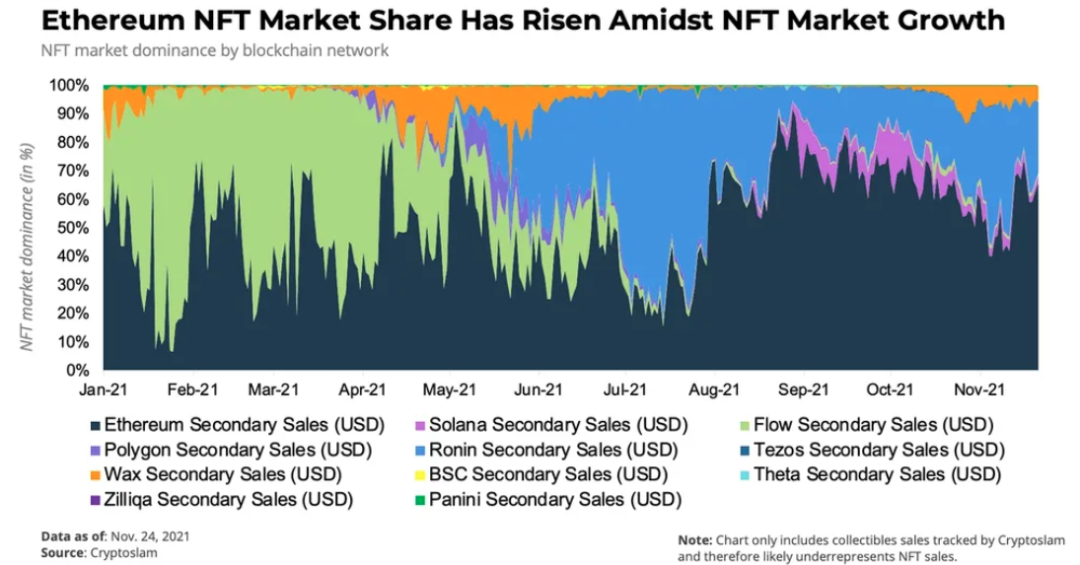 几个区块链正在为消费者应用程序开发强大的生态系统,建立在 NFT 支持的数字所有权的基础上。蓬勃发展的 NFT 多链未来正在迅速逼近。三个 Layer1 区块链拥有近 10 亿美元的二级交易量(以太坊、Flow、Solana),而以太坊以近 100 亿美元的二级 NFT 销售额领先所有区块链和 Layer2。
