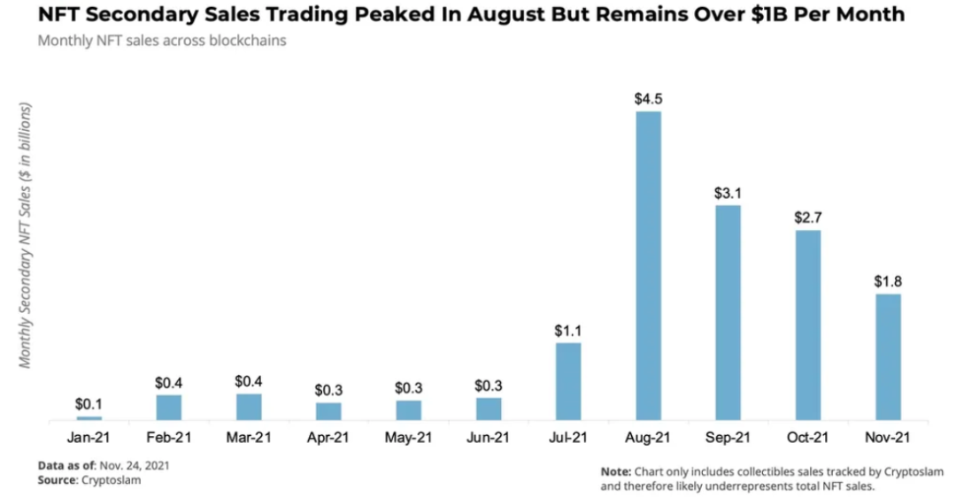 事后看来,2021 年 8 月是 NFT 二级销售额超过 45 亿美元的高峰,如果考虑到艺术品销售和非 Cryptoslam 追踪的 NFT(例如数字土地),可能更多。