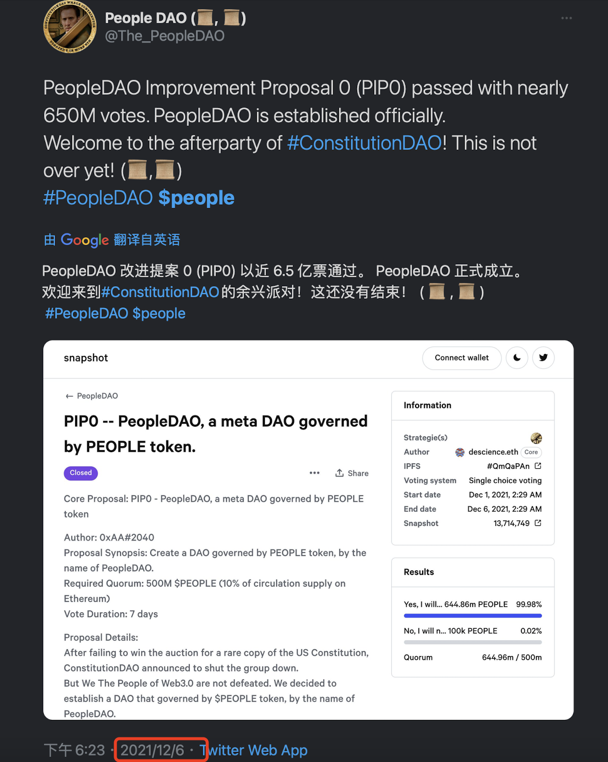 最近,一个名为ConstitutionDAO的团队只用了几天时间就筹集到了11000+ ETH(5000+万美元),试图用于购买一份于周四在苏富比拍卖的罕见宪法副本。美国宪法有13个副本,其中12个副本在博物馆里面,有一个副本是拿出来拍卖的。值得注意的是,为ConstitutionDAO捐款的用户可以得到对应的PEOPLE代币。你捐一个ETH,就给你100万个people代币,也就是按照当时ETH的价格,总共募集资金大概在4700万美元。当时捐赠的名人有很多,三箭合伙人,孙割,爆炸头等等。这个过程可谓是大起大落,首先是竞拍当天,一个华尔街大佬, Citadel的CEO,KEN Griffin出更高的价格,将宪法收入囊中,所以ConstitutionDAO就竞拍失败了。竞拍失败之后呢,ConstitutionDAO就做出决定,开通退款通道,100万个people币兑换1个ETH。 因为当时募集了大约1万个,所以people代币的总量就为大约50亿个,很多捐赠人并不是币圈的,所以有很多人选择换回ETH,一旦决定换回ETH,那么对应的people就自动打入黑洞地址,也就是说people自动带有通缩机制。但有一些用户赎回用于捐款的ETH。people因为是购买宪法而诞生的一个meme币,按理来说,是没有价值的,最大的价值是国库兜底,随时可以用people去JuiceBox上面兑换回ETH接着。但这个时候有鲸鱼入局大单买入PEOPLE,PEOPLE在推特热度开始暴涨,价格从$0.004三天飙升至$0.17,至此DAO概念彻底出圈。但是巨鲸入场也是为了赚钱,随后PEOPLE也从$0.17跌至0.04,然后随着peopleDAO组织出现,12月6号在snapshot发起了第一个治理投票,有超过10%的持币数量支持通过提案。