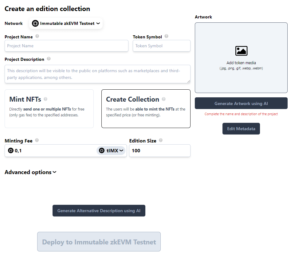 - Fill in all the fields and click "Deploy to Immutable zkEVM Testnet", sign the transaction