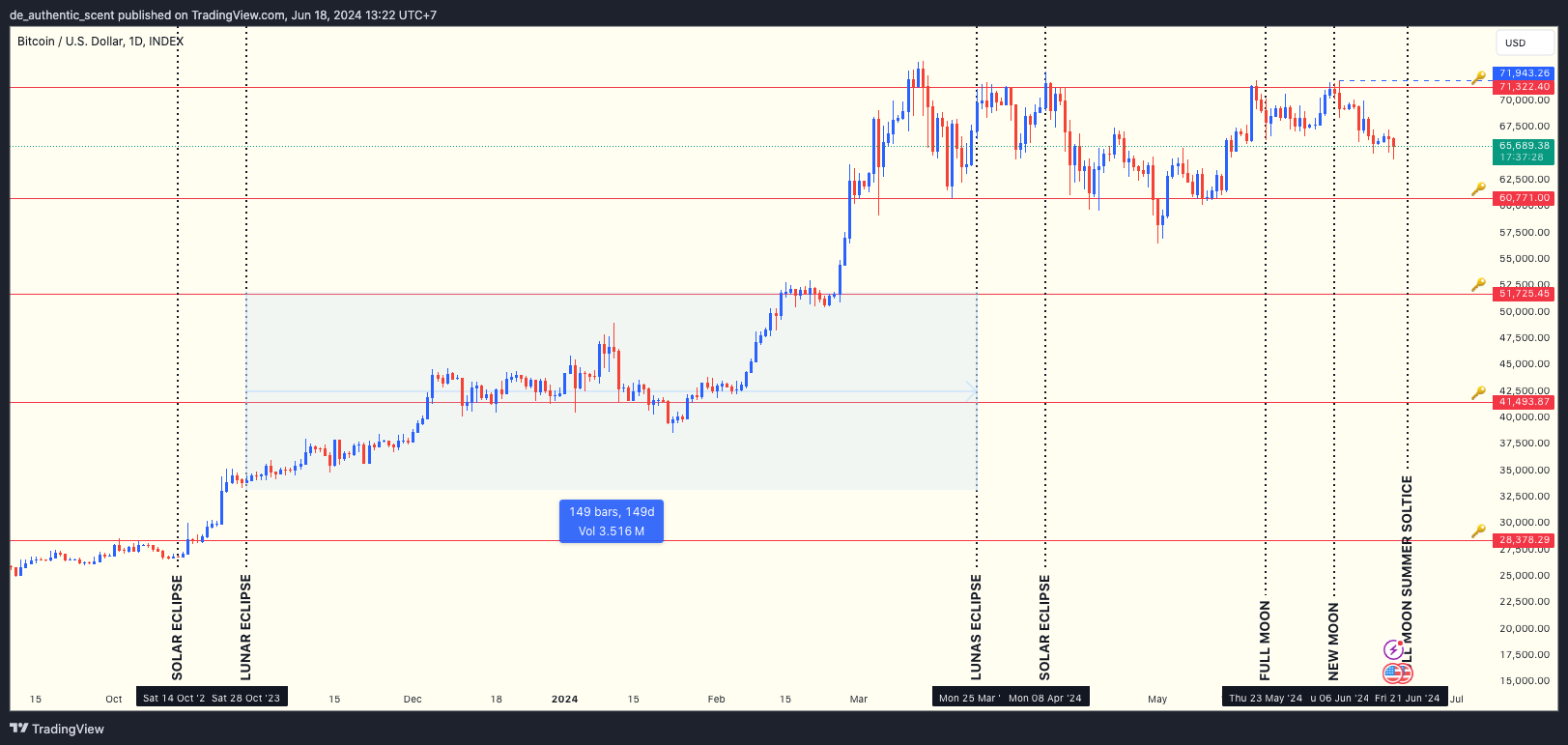 Pictured above, the New Moon on June 6th saw the market print a high of ~72K. Since then, we have been trending down/bearish. I expect this trend to last until around the Full Moon (June 21st, but up until the 24th). We could potentially see a significant drop before then.
