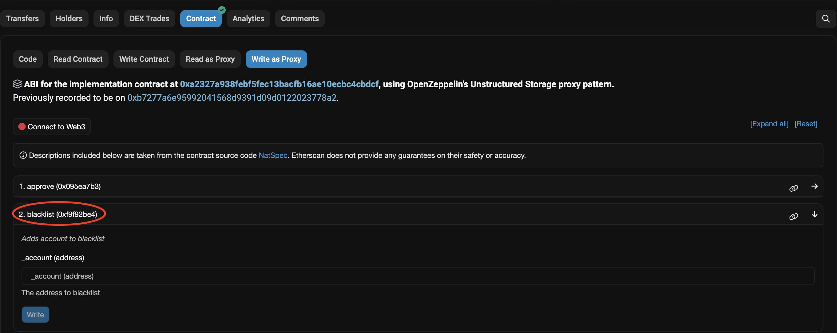 那么为什么说掌握稳定币还可以掌握一些协议的生杀大权呢?如果打开以太坊区块链浏览器找到USDC的智能合约,你会发现有一个叫Blacklist(黑名单)的功能函数,这是干什么的呢?没错,就是个黑名单,可以将任何以太坊上的地址拉黑(包括协议)