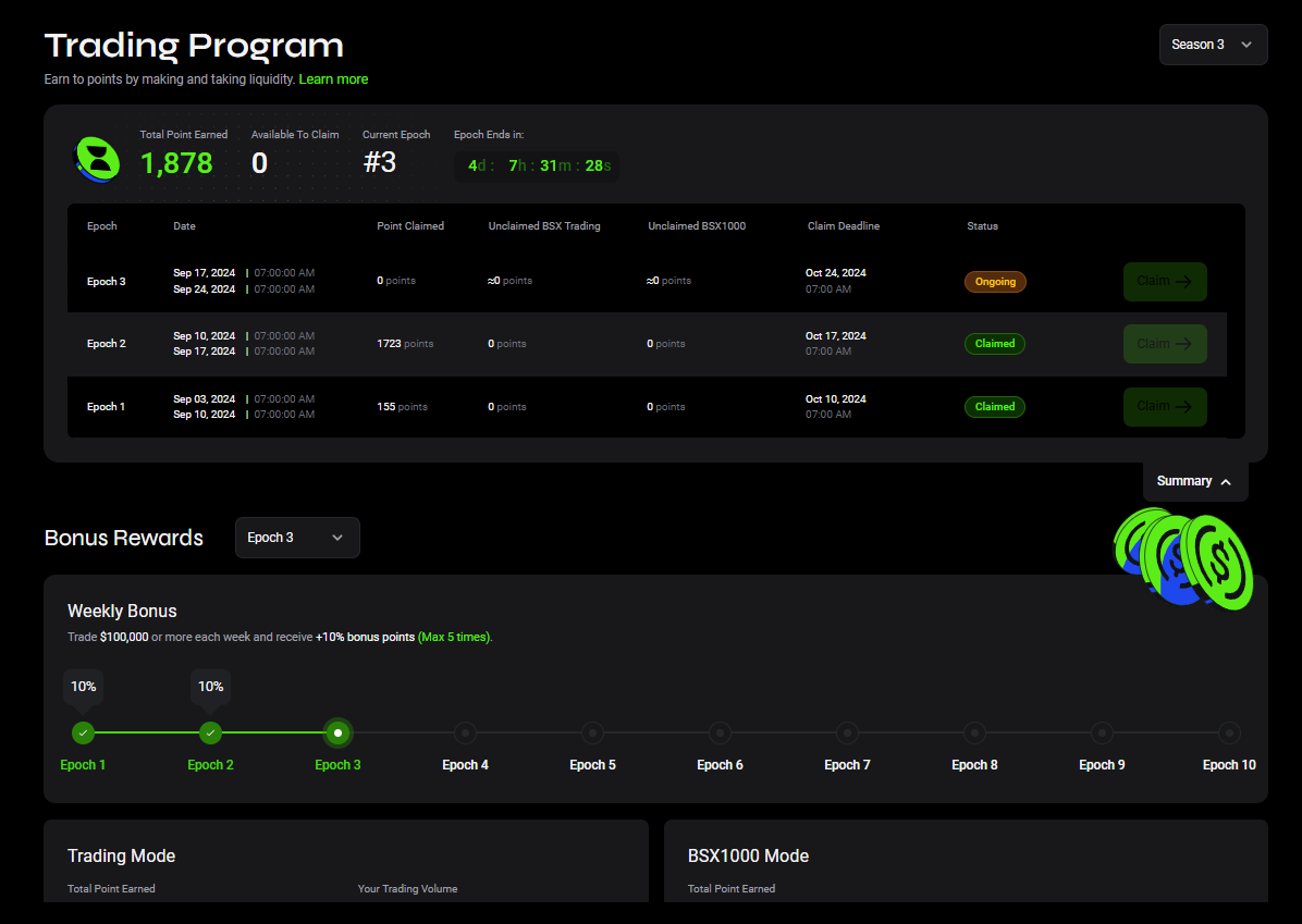 • Users who participated in Season 2 or Season 1 and continue with the BSX protocol will receive 10% boosted loyalty points in Season 3.