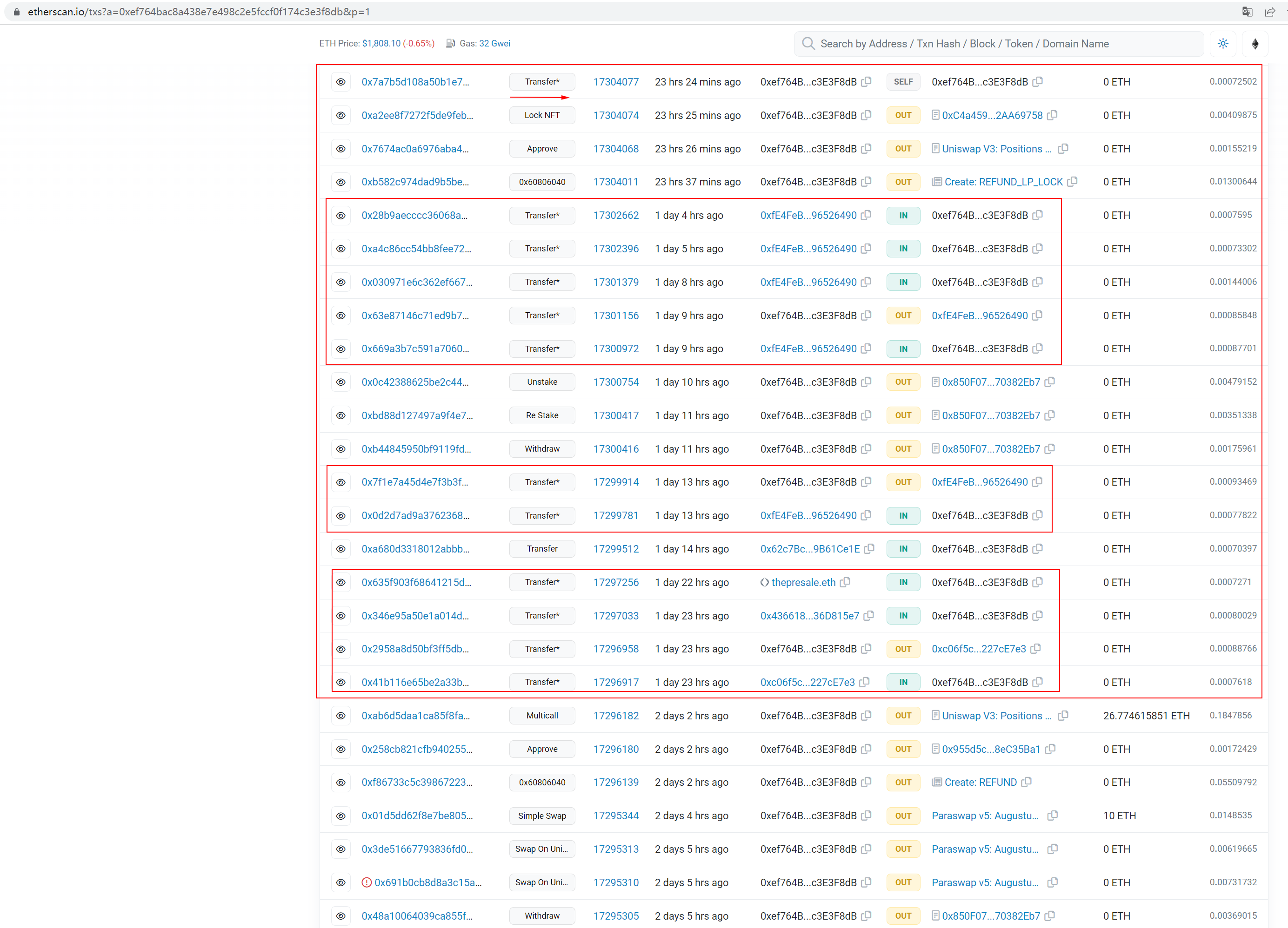 注意下方带星号的 Transfer 交易,这是 $RFD 的部署者 0xef764bac8a438e7e498c2e5fccf0f174c3e3f8db(blurr.eth) 与 粉丝 和 蹭热度 各种问 与 答 的链上聊天文本交流记录(截止到目前为止的所有记录):