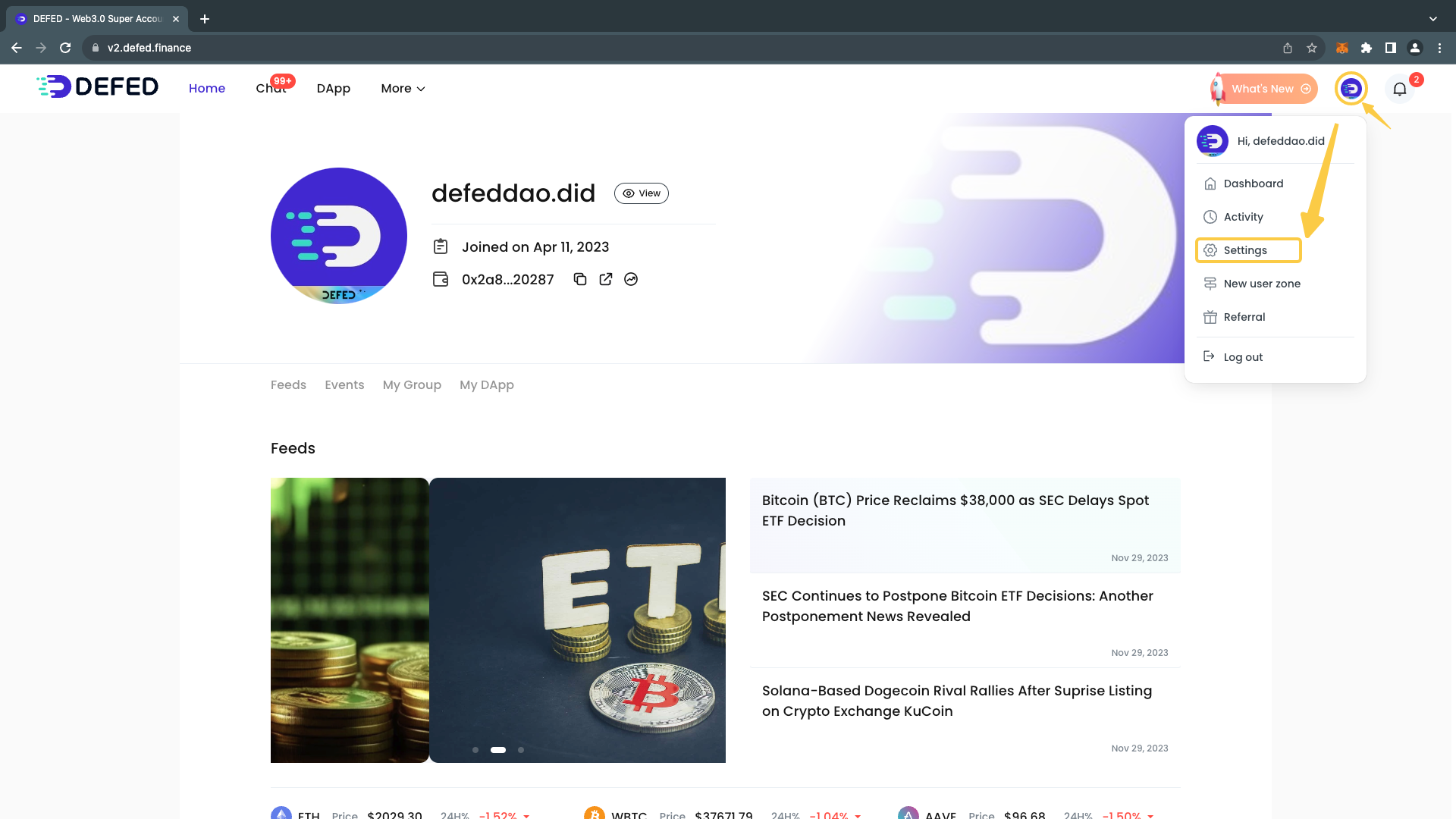 アバターをクリックし、ドロップダウンメニューで「Settings」にアクセスしてください。