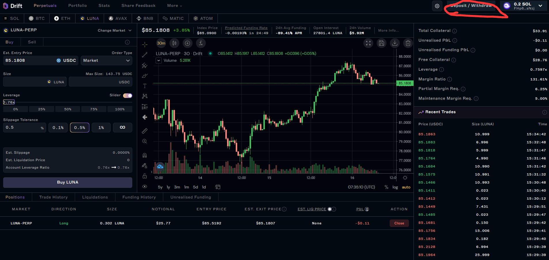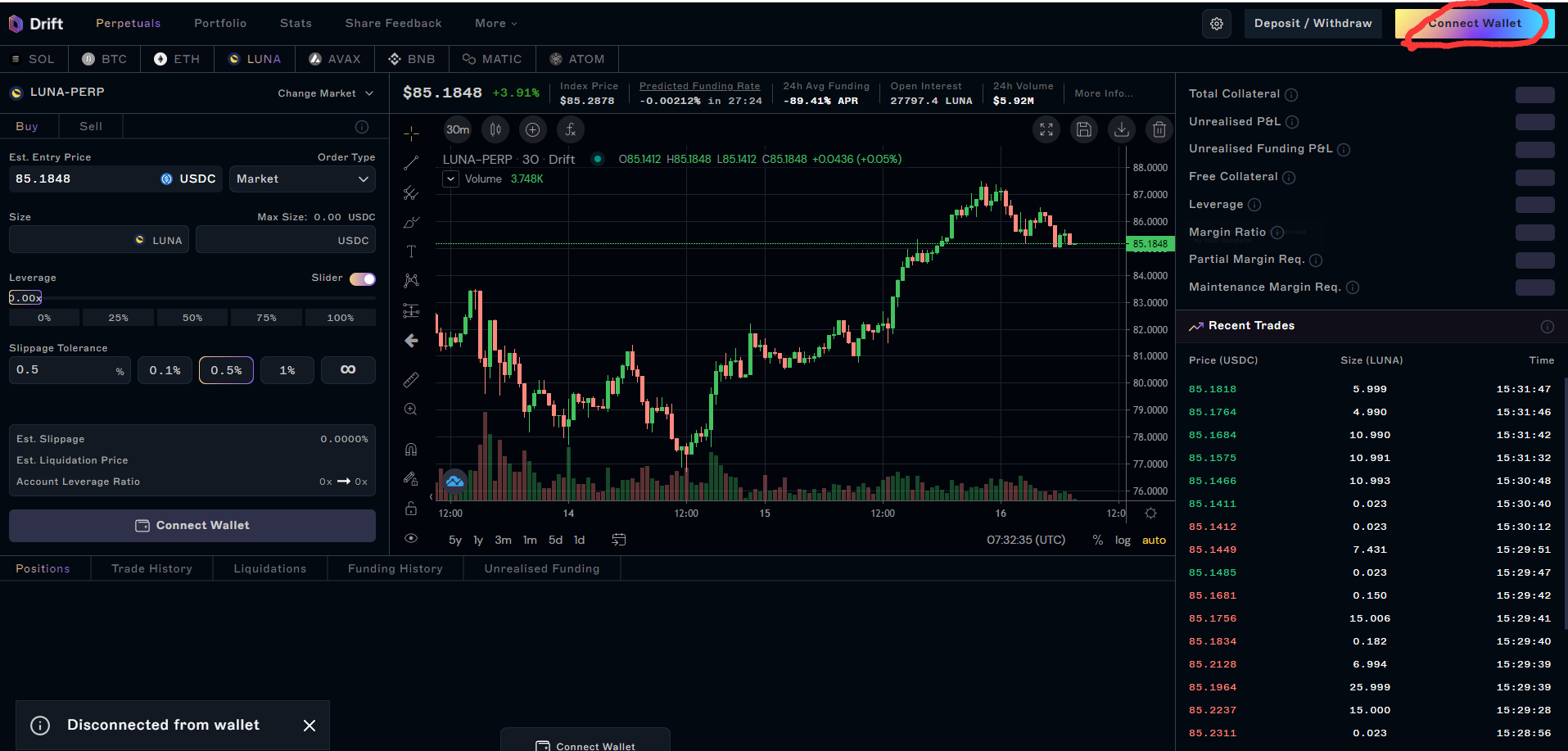 4.如果想刷交易量和交易次数来博空投,可以在Drift和其它交易所之间开对冲单。例如可以在Drift开一个1倍杠杆的SOL多单,然后在币安开一个1倍的空单,这样就能够实现无风险地刷交易量。毫无疑问,如果该项目以后发币空投,那么交易量越高,交易次数越多的钱包地址得到空投的机会越大,得到的数额也会越多。