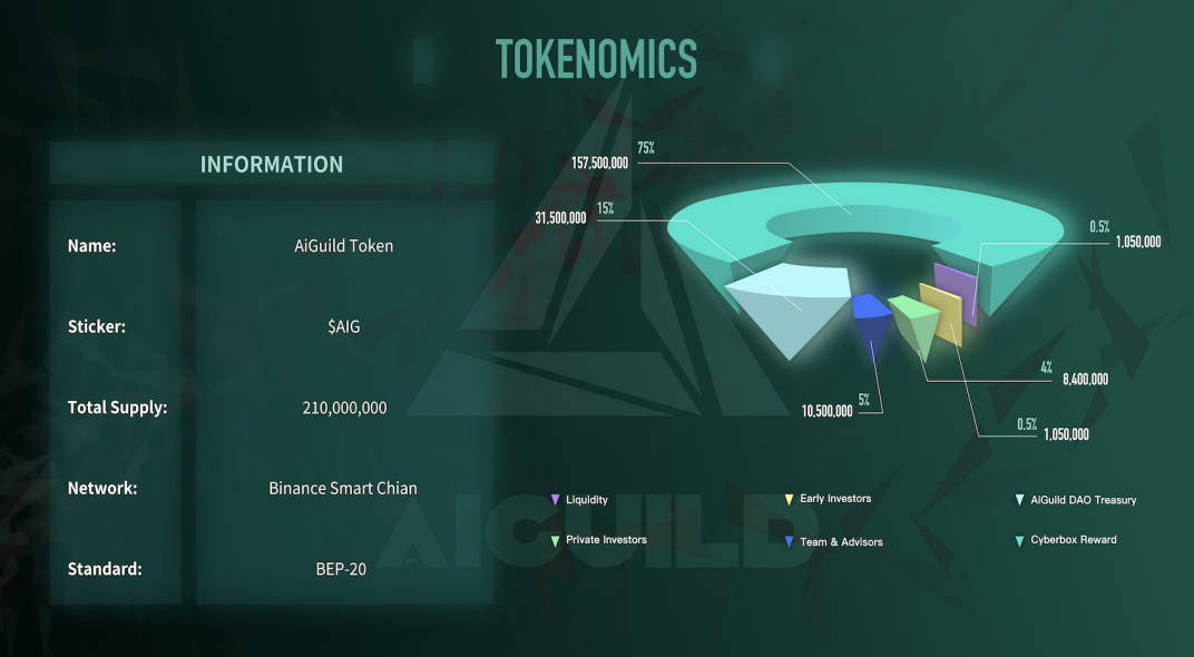 The total supply of AIG is 210,000,000. has gone live on Pancake on May 8, 2022 at 0:00:00 UTC with the following token allocation.