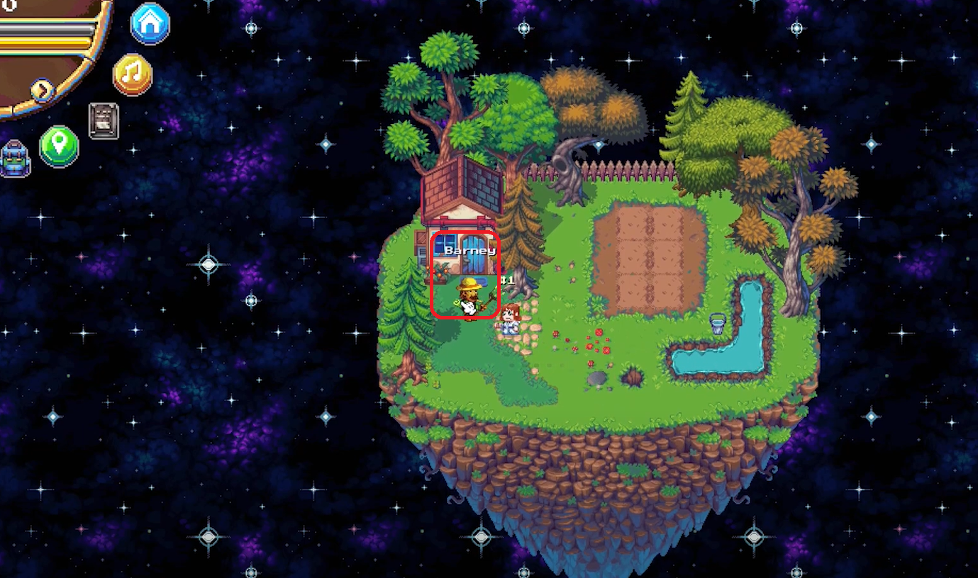 使用键盘上下左右靠近这个叫Barney的大叔,点击大叔和他对话,跟着他的对话引导一点点完成种植、浇水、施肥和收获的任务,其实也相当于入门告诉你农场的基本操作,完成后除了获取到积分,你的账户还会有一些农作物、工具和种子。
