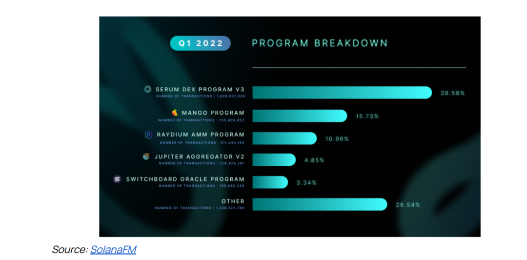 他们 13% 和 99% 的程序执行也被路由到 Serum。2022 年第一季度, Solana 中 50% 涉及 Serum 程序。这给 Solana 生态系统带来了巨大的例如 Serum 的单点故障风险, 如果涉及到流动性和交易问题, 那么多 Solana 上的核心 Defi 协议将会受到影响。