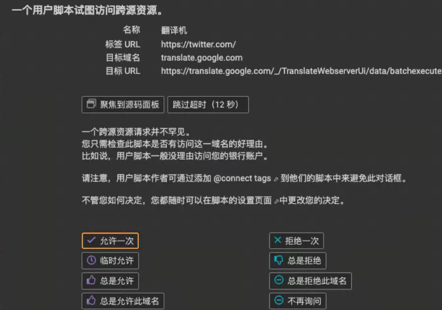 之后访问twitter、discord等网站,系统会弹出如下图所示页面,选择总是允许即可,油猴就会自动翻译对应的英文内容:
