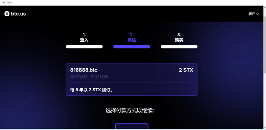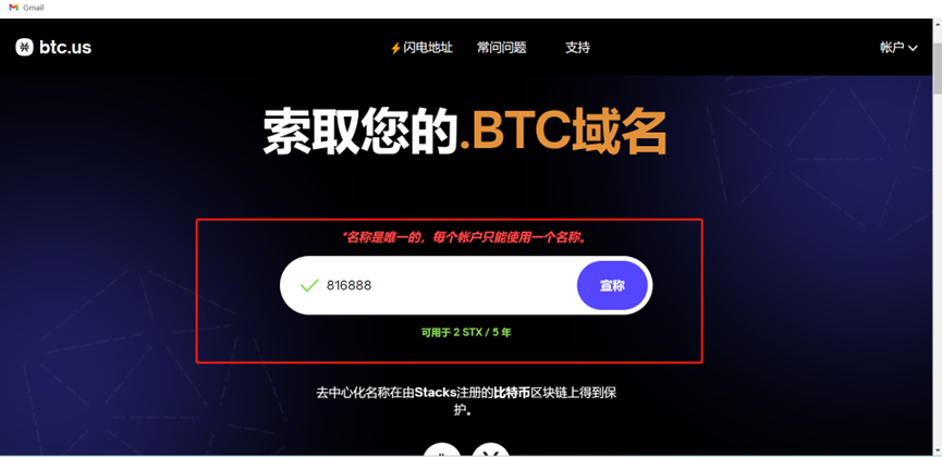 注意:bns的.btc域名,目前注册一个需2个stx,可用5年(暂定是每5年以2stx续费)。可以注册英文,阿拉伯数字等。
